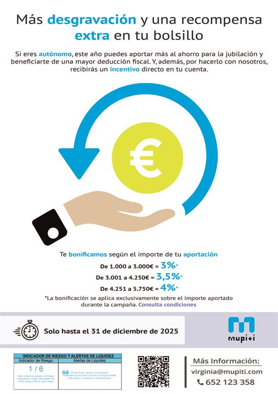 Las aportaciones realizadas hasta el 31 de diciembre de 2025 tendrán derecho a una bonificación directa en cuenta corriente, según los siguientes tramos:
